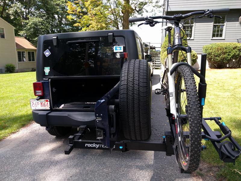 I went with the Quadratech Folding Hitch, which will accommodate up to 4 bikes. It allows you to fold it down out of the way to open the tailgate without completely removing the hitch and it'll clear a bigger than stock tire. That way if you want to leave it on the Jeep full time, you still retain access to your trunk. But on those occasions when you have bikes mounted on it, you have to remove the bikes first before it can be folded down.